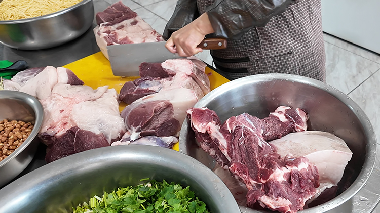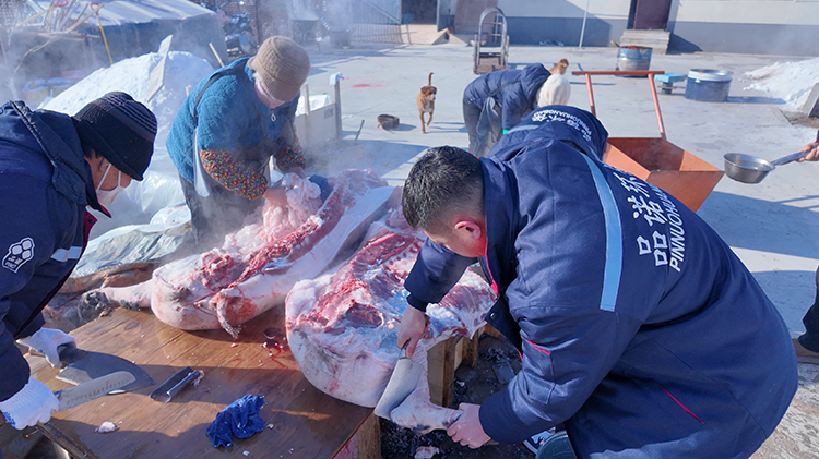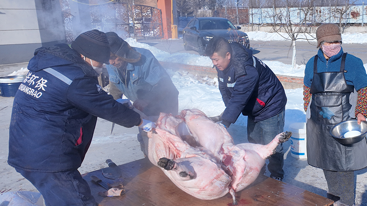 为了让大家吃到地道又鲜美的东北风味,公司特意采购了一整扇新鲜猪肉。刚运到公司,后勤的同事们就麻利地忙活起来:选肉、切块、清洗,每一个步骤都细致又用心。肥瘦相间的五花肉被切成均匀的薄片,带着新鲜的肉香,自家腌渍的酸菜脆嫩爽口,提前冲洗沥干,就等着和猪肉来一场完美邂逅。