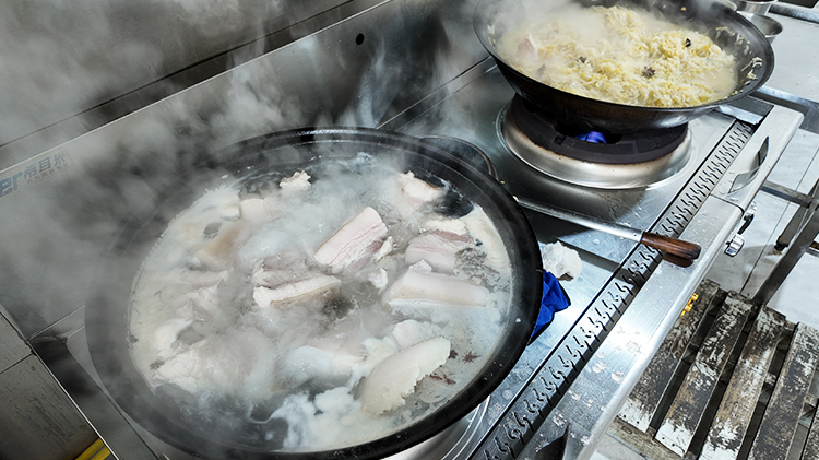食堂里更是烟火气十足。大厨架起厚实的铁锅,先放少许猪油烧热,丢几颗花椒爆香,再把酸菜丝倒进锅里翻炒,直到酸香完全释放。接着倒入足量的高汤,大火烧开后,将切好的白肉片一片片均匀铺在汤面上,转小火慢慢炖。不一会儿,锅里的汤汁就开始翻滚,酸香、肉香交织在一起,弥漫了整个食堂,让人忍不住咽口水。