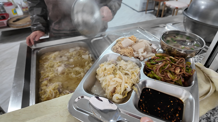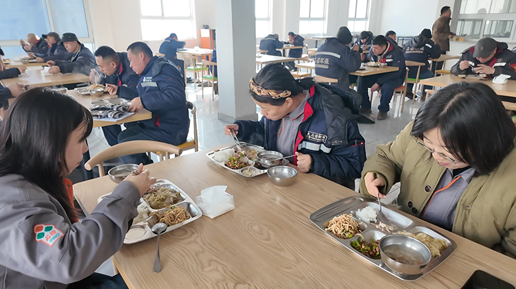 午餐时间一到,员工们有序排队取餐。一碗碗热气腾腾的猪肉炖酸菜端上桌,肉片肥而不腻、瘦而不柴,吸饱了酸菜的汤汁;酸菜酸香醇厚,中和了肉的油腻;浓稠的汤汁泡上米饭,一口下去,暖流从舌尖滑到胃里,浑身的寒气瞬间消散无踪。大家围坐在一起,一边品尝着美味,一边分享着工作中的趣事,欢声笑语中,满满的都是家的温暖。